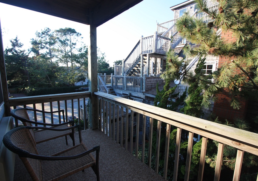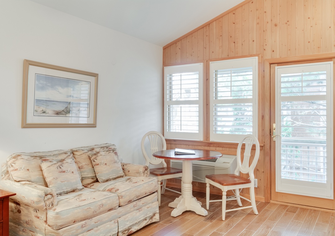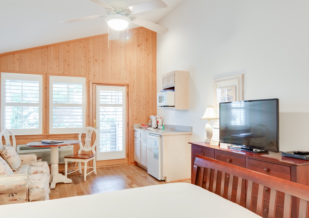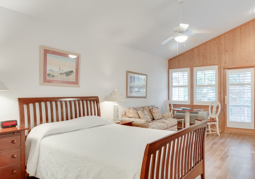 This second floor studio offers a Queen Bed, Twin Sleeper Sofa, TV, DVD, porch, wireless internet access, washer/dryer access, phone, table with two chairs, and kitchenette with toaster, mini-refrigerator, microwave, coffee maker, and sink.