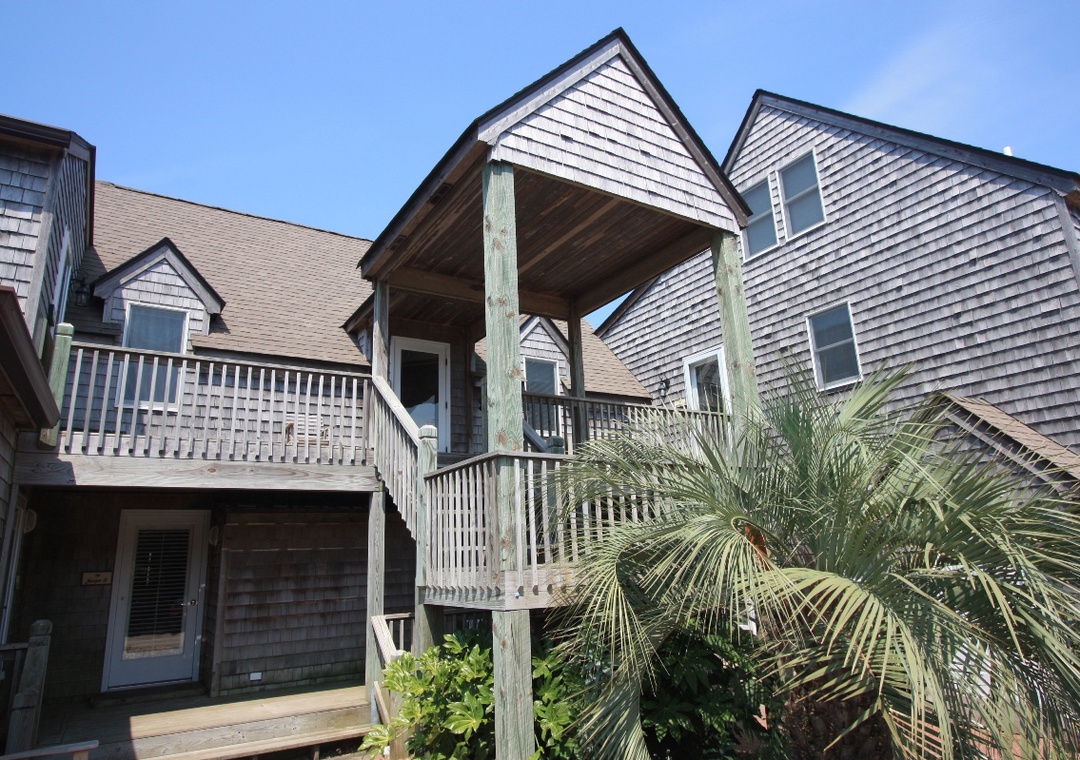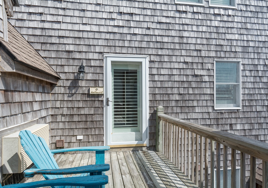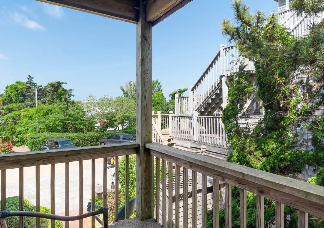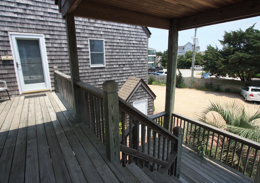 This second floor studio offers a Queen Bed, Twin Sleeper Sofa, TV, DVD, porch, wireless internet access, washer/dryer access, phone, table with two chairs, and kitchenette with toaster, mini-refrigerator, microwave, coffee maker, and sink.
