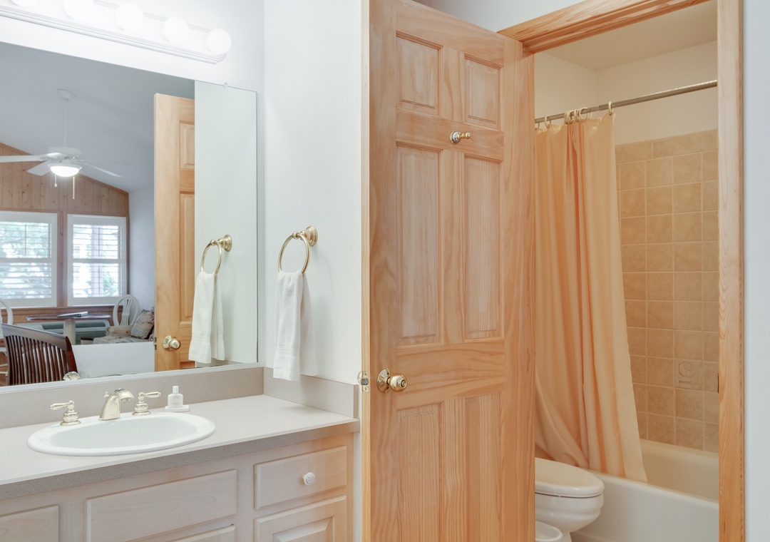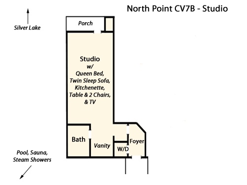 If you have additional people in your group, you may combine rental of this suite with North Point A which would expand your total occupancy to 5 people, including children. Accommodations would include a large living room, a full kitchen and dining area, a private bedroom with a Queen bed, and a full master bath with a whirlpool tub and separate shower.