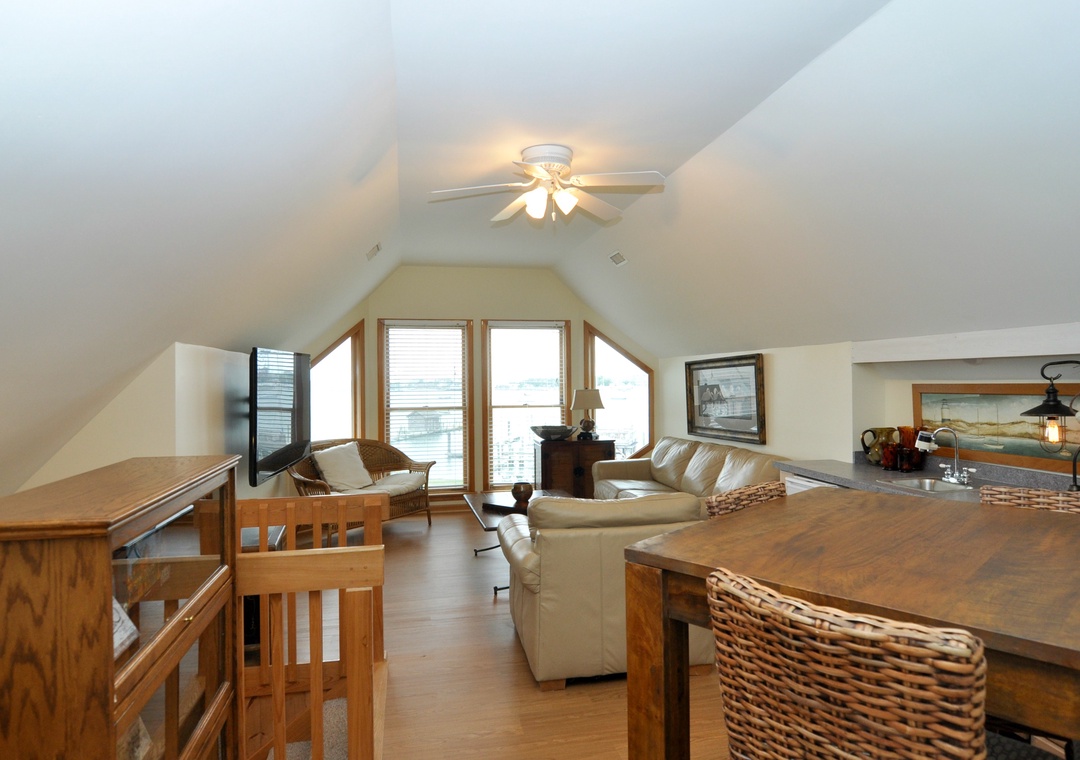 Second Floor: Primary Bedroom with King bed and Master Bath with tub/shower. Primary Bedroom with King bed and a Primary Bath with tub/shower. Loft Sitting Area with TV. Two Twin size convertible ottoman beds. These ottomans each convert to a single bed for versatile sleeping arrangements.